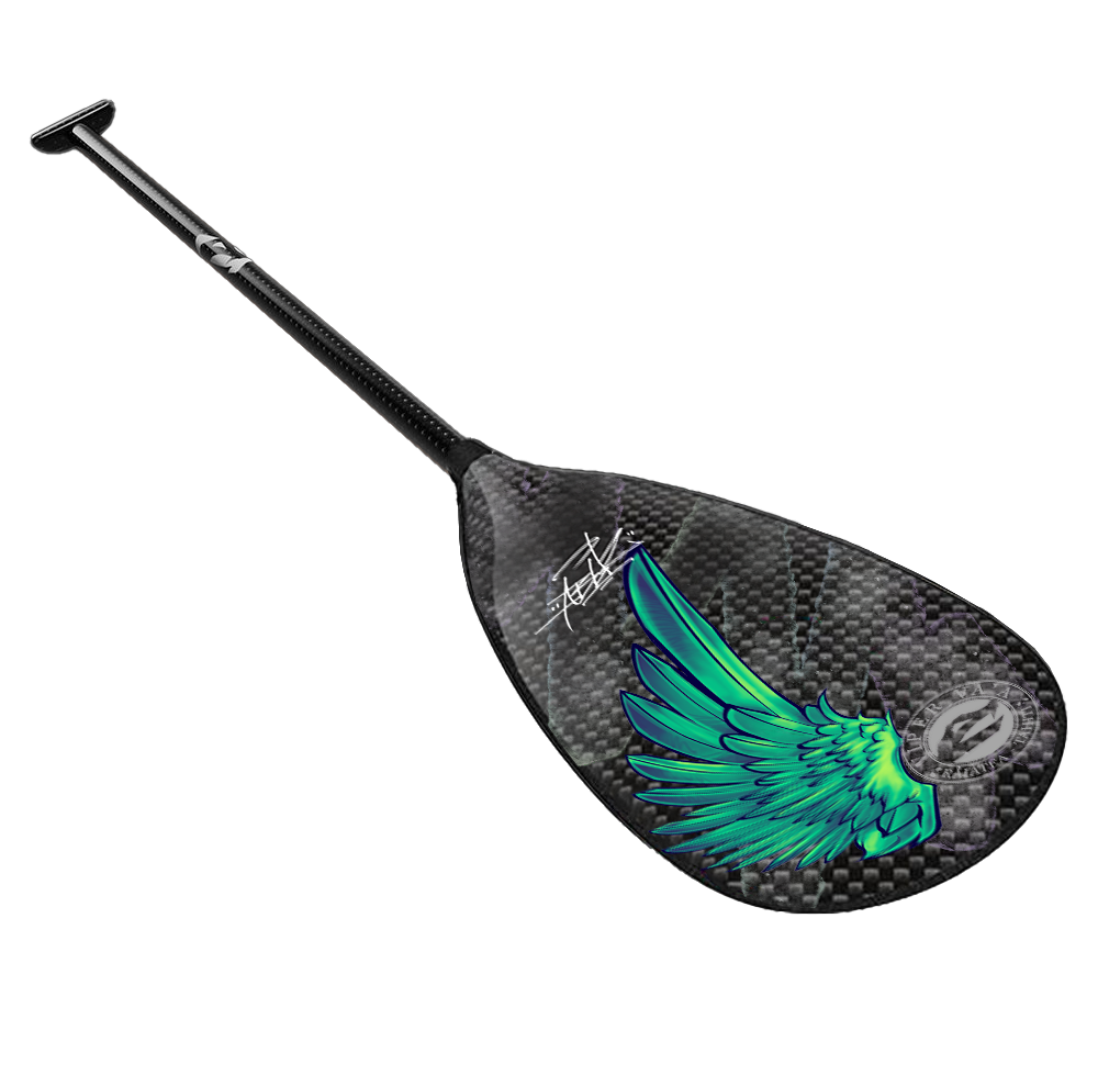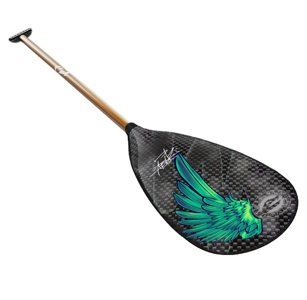 The blade is constructed from high-performance multiaxial carbon fiber and paired with your choice of a carbon or bamboo shaft. The bamboo shaft is slightly heavier than its carbon counterpart but offers superior impact resistance. Both options are stiff, durable, and built to perform in the toughest racing environments.